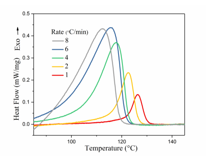 依據(jù)結(jié)晶動力學(xué)測定標(biāo)準(zhǔn)GB/T 19466.7,利用差示掃描量熱法研究聚合物結(jié)晶動力學(xué)。在 1、2、4、6、8°C/min 的降溫速率下,聚丙烯PP的熔體結(jié)晶 DSC 放熱曲線如圖4所示。在不同的降溫速率下,結(jié)晶峰均顯示一個單峰。隨著降溫速率的升高,結(jié)晶放熱峰呈現(xiàn)寬度逐漸變大且不斷向低溫方向偏移的趨勢。通過切線法可以獲得不同降溫速率下的結(jié)晶放熱峰峰溫 Tp 與結(jié)晶峰起始溫度 T0的值。DSC曲線幫助用戶更好地理解物質(zhì)的熱性質(zhì)和結(jié)晶行為。