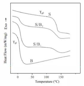玻璃化轉(zhuǎn)變表示高分子材料從“玻璃態(tài)”轉(zhuǎn)變?yōu)椤跋鹉z態(tài)”的過程。在玻璃化溫度Tg以下,分子運動基本凍結(jié);到達(dá)Tg時,分子運動活躍起來,熱容量增大,曲線向吸熱一側(cè)偏移。非晶態(tài)不相容的二元共聚物一般有兩個玻璃化轉(zhuǎn)變,而且玻璃化轉(zhuǎn)變特性有所不同。圖3是苯乙烯-丁二烯-苯乙烯(SBS)的嵌段共聚物的DSC曲線,曲線B和曲線S分別代表有一定交聯(lián)的聚丁二烯和聚苯乙烯均聚物的熱轉(zhuǎn)變曲線。共聚后的熱塑性彈性體SBS有兩個玻璃化轉(zhuǎn)變溫度Tg1和Tg2,分別向高溫側(cè)和低溫側(cè)偏移。玻璃化轉(zhuǎn)變溫度可以分析材料凝聚態(tài)結(jié)構(gòu),指導(dǎo)科學(xué)研究和工業(yè)生產(chǎn)。
