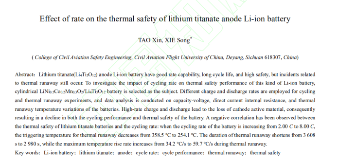 為了深入探究不同充放電倍率對(duì)鈦酸鋰負(fù)極鋰離子電池?zé)岚踩挠绊?,中?guó)民用航空飛行學(xué)院安全工程學(xué)院謝松老師課題組利用BAC-800A大電池絕熱量熱儀,對(duì)鈦酸鋰負(fù)極鋰離子電池在不同循環(huán)倍率下的熱失控行為進(jìn)行了詳盡的測(cè)試與分析。此次研究通過(guò)系統(tǒng)分析電化學(xué)特征參數(shù)與熱失控特征參數(shù),揭示了充放電倍率對(duì)鈦酸鋰電池?zé)岚踩阅艿膬?nèi)在影響機(jī)制。相關(guān)研究結(jié)果已發(fā)表在《電池》期刊,該成果由四川省重點(diǎn)研發(fā)計(jì)劃(2022YFG0236)、 四川省重點(diǎn)實(shí)驗(yàn)室自主項(xiàng)目(MZ2022JB02)支持。