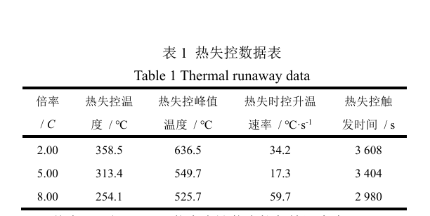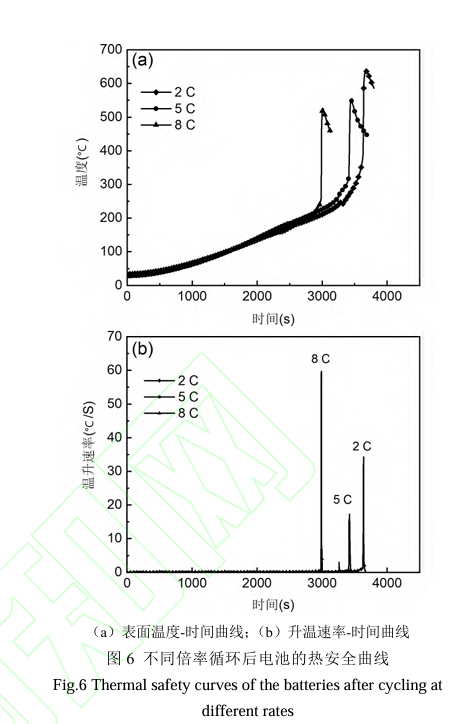 測(cè)試結(jié)果表明,隨著充放電倍率的增加,電池的熱安全性呈現(xiàn)明顯的下降趨勢(shì)。具體而言,當(dāng)循環(huán)倍率由2.00 C升至8.00 C時(shí),熱失控觸發(fā)溫度由358.5 ℃降低至254.1 ℃,熱失控時(shí)間由3608秒縮短到2980秒,熱失控時(shí)的最大升溫速率則由34.2 ℃/s增加至59.7 ℃/s。這些數(shù)據(jù)直觀地反映了高倍率充放電對(duì)鈦酸鋰電池?zé)岚踩阅艿呢?fù)面影響。