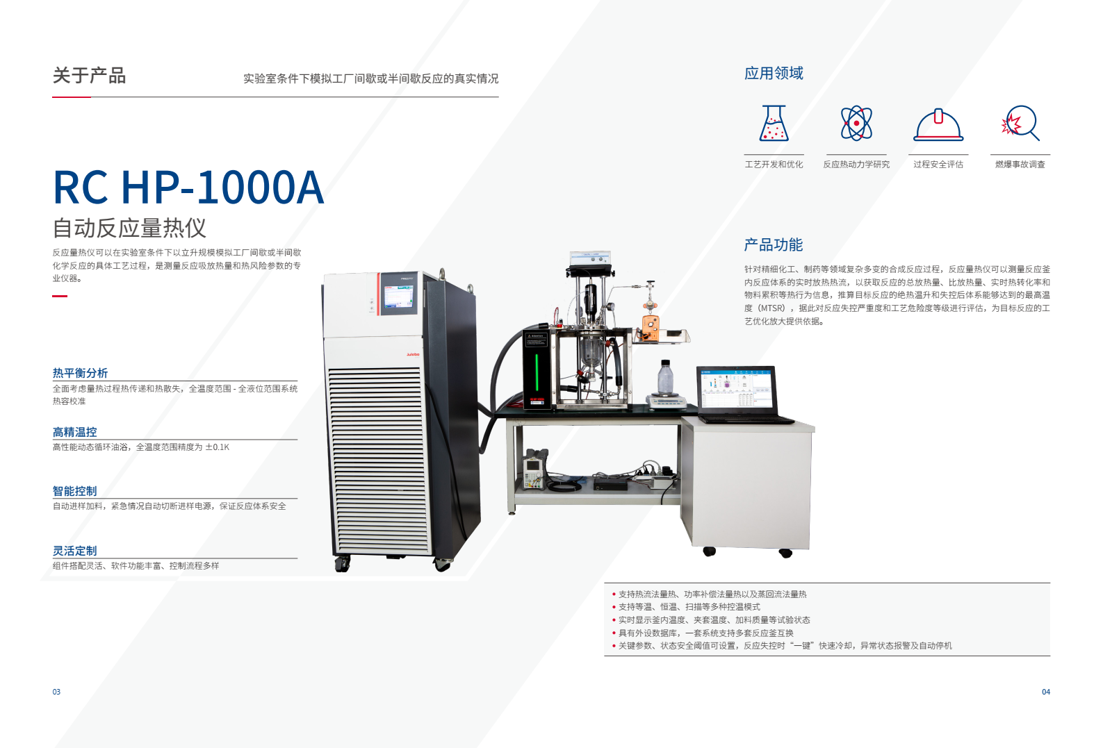 用戶可實時測量反應釜內樣品的反應放熱熱流,以獲取反應物的總放熱量、比放熱量、實時轉化率和物料累積等熱行為信息,自動標定物料體系比熱容、傳熱系數(shù),推算目標反應的絕熱溫升和失控后體系能夠達到的最高溫度,據(jù)此對反應工藝危險度進行評估,為目標反應的工藝優(yōu)化放大提供依據(jù)。