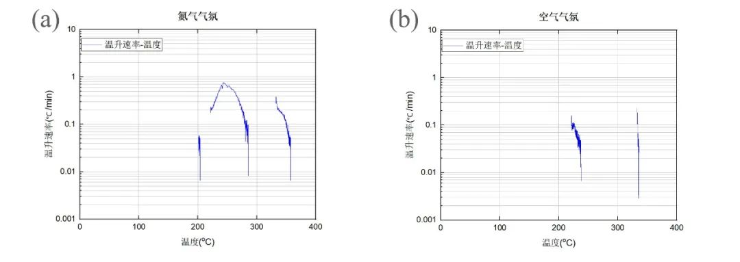 圖2 (a)氮氣和(b)空氣氣氛下樣品溫升速率-溫度曲線