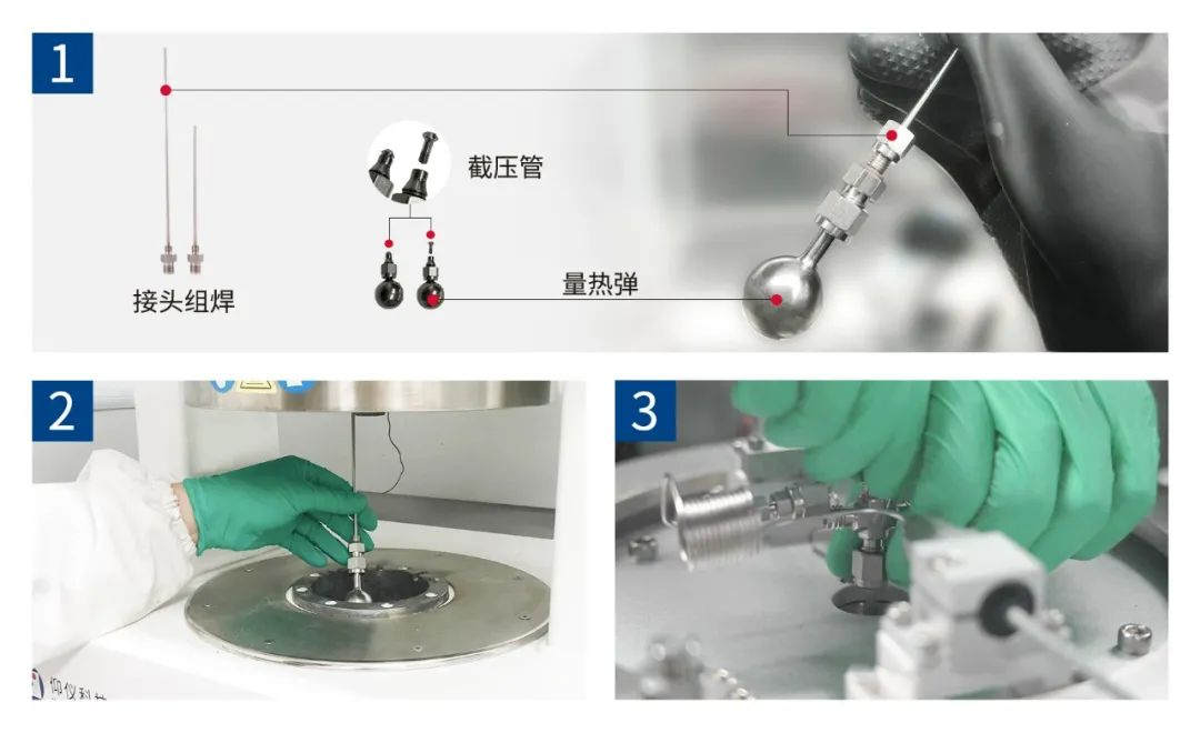 (1) 稱量0.6g樣品,裝入量熱彈內(nèi)。在量熱彈進(jìn)樣口處放置截壓管,隨后與接頭組焊連接,組件擰緊后截壓管可將量熱彈完全密封。整個制樣過程在氮氣手套箱內(nèi)完成;