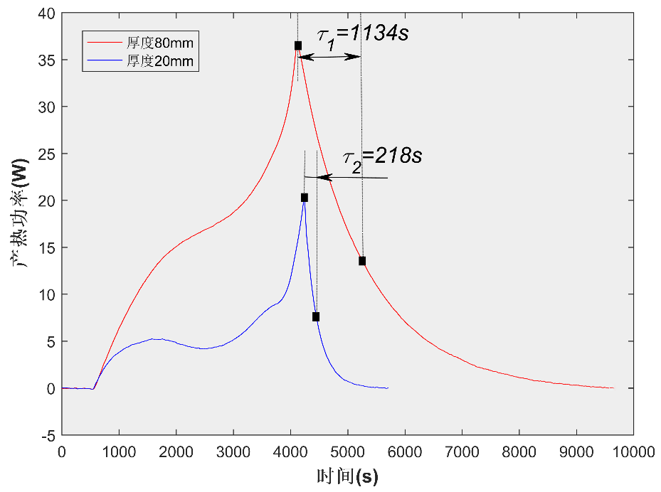 由于厚度不同的電池在容量上難以一致,因此本文選用兩款容量不同、大面面積相似、而厚度分別為20mm和80mm的磷酸鐵鋰電池(#1和#2),進行1C恒流放電實驗。理論上放電過程中電池內阻隨SOC下降而單調遞增,所以放電結束時刻電池產熱功率應達到最大值。但等溫量熱儀測量存在的熱滯后效應導致放電結束后熱功率曲線需要經過一定時間才能衰減為零。此處定義放電結束后功率從峰值衰減至峰值1/e的時間τ為熱滯后時間常數(shù)。τ的大小與電池至加熱片之間非穩(wěn)態(tài)傳熱的時間常數(shù)相關。如圖2所示,對于厚度為80mm的#2電池,τ?=1134,明顯大于#1電池的計算結果(τ?=218),說明電池厚度增加會顯著影響電池產熱測量的動態(tài)響應,這可能是由于電池熱容和內部熱阻都與厚度正相關。