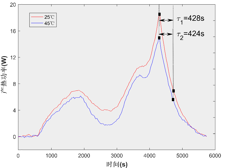 不同工作溫度下電池產熱特性存在差異。如圖4,在45℃條件下#3電池產熱功率略小于25℃下的結果,但兩者的熱滯后時間常數(shù)基本一致??梢猿醪秸J為溫度與熱滯后沒有明顯關聯(lián)性,這可能是由于溫度小幅度變化對系統(tǒng)傳熱特性幾乎沒有影響。