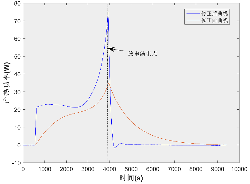 修正前后的產熱功率曲線如圖5所示,可以發(fā)現(xiàn)修正后的曲線幾乎消除了放電結束后的功率衰減時間,能夠更好地反映電池瞬態(tài)產熱特性。