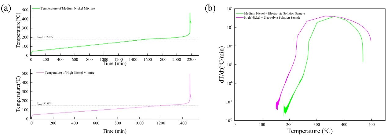圖3 高鎳正極材料、電解液及兩者混合物的HWS(a)溫升曲線和(b)溫升速率-溫度曲線