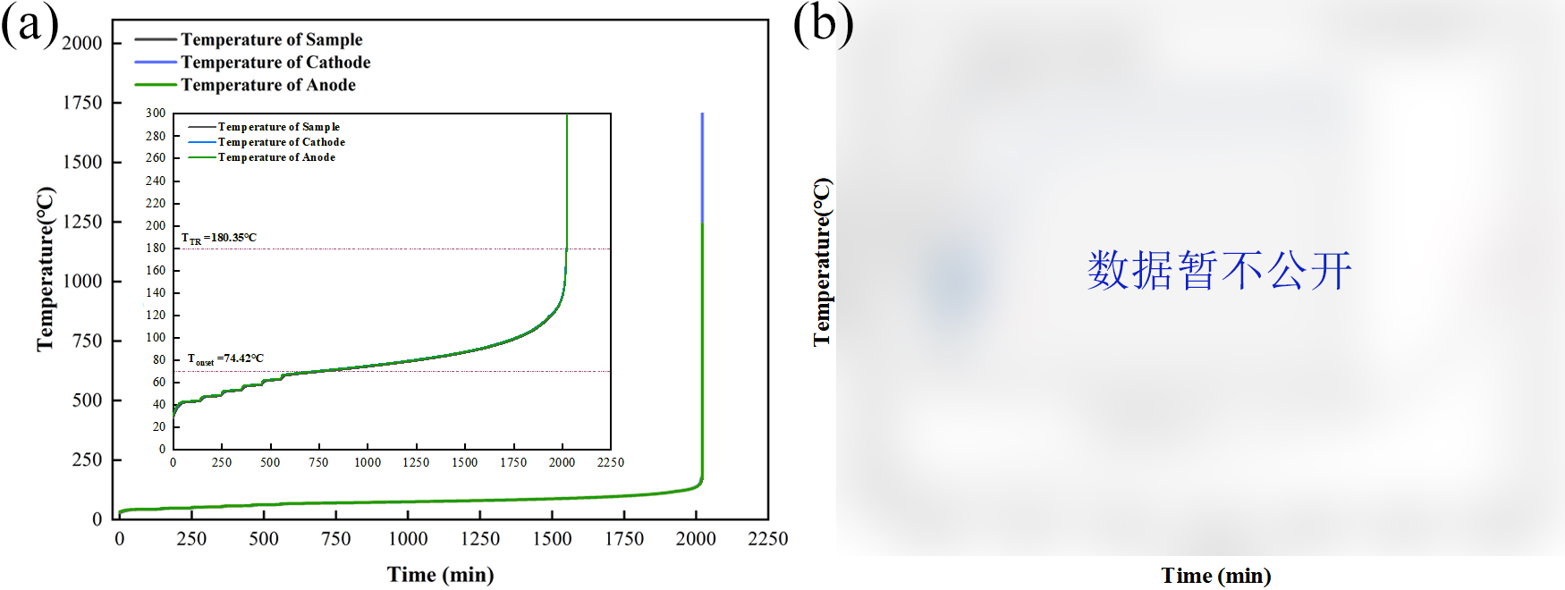2. 熱失控起始溫度接近鋰金屬熔點(diǎn):熱失控起始溫度TTR約為180℃,該溫度下鋰金屬負(fù)極熔化,電解質(zhì)與熔融鋰金屬發(fā)生界面反應(yīng),產(chǎn)生的氧氣會(huì)誘發(fā)鋰金屬發(fā)生劇烈氧化反應(yīng),導(dǎo)致熱失控發(fā)生[1]。根據(jù)圖2b,到達(dá)TTR之前電芯升溫速率出現(xiàn)明顯下降,與負(fù)極熔化過(guò)程相對(duì)應(yīng)。
