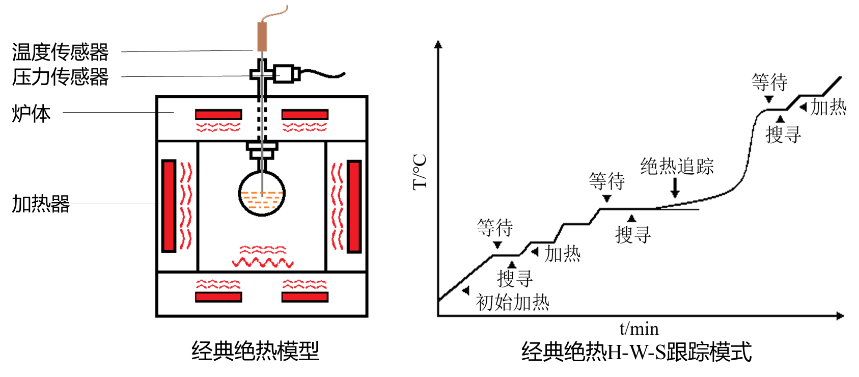 絕熱加速量熱儀的經(jīng)典工作模式為“加熱—等待—搜尋”(H-W-S)模式,工作前可設(shè)置實(shí)驗(yàn)起始溫度、終止溫度、斜率敏感度、加熱幅度和等待時(shí)間等參數(shù)?!凹訜帷彪A段,量熱儀的溫度按設(shè)定的加熱幅度升高;“等待”階段,控制器通過比較樣品室溫度與絕熱爐各個(gè)區(qū)域的溫度,保持絕熱爐內(nèi)的溫度處于均勻平衡狀態(tài);“搜尋”階段,若檢測(cè)到樣品升溫速率大于設(shè)置的閾值(如0.02℃/min),則進(jìn)入絕熱追蹤階段,通過程序控溫保持樣品池四周的絕熱環(huán)境;否則,量熱儀自動(dòng)進(jìn)入下一個(gè)“加熱—等待—搜尋”流程。