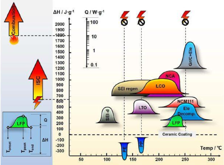 (1)自反應放熱階段:由于內(nèi)部短路,外部加熱或者電池自身在大電流充放電時自身發(fā)熱,使得電池內(nèi)部溫度上升至90~100℃左右,SEI膜開始收縮分解,正負極材料與電解質(zhì)發(fā)生接觸,負極開始與電解液反應,放出熱量進一步提高溫度;