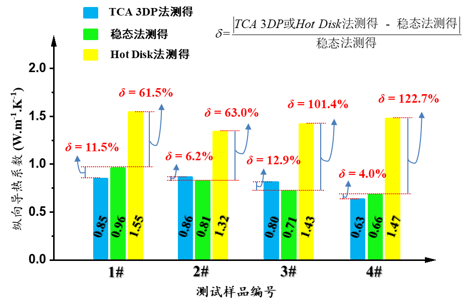 此外,為了驗證TCA 3DP和Hot Disk兩種方法的準確性,我們以穩(wěn)態(tài)法的測試結(jié)果作為參標,計算這兩種方法測定的縱向?qū)嵯禂?shù)與穩(wěn)態(tài)法的相對偏差,結(jié)果如圖4所示。可以看出,TCA 3DP法測得的結(jié)果與穩(wěn)態(tài)法更為接近,相對偏差在4% ~ 11.5%之間,而Hot Disk法測得的結(jié)果與穩(wěn)態(tài)法差別較大,相對偏差在61.5% ~ 122.7%之間。因此,我們可以得出結(jié)論相比于Hot Disk法,TCA 3DP法測得的導(dǎo)熱系數(shù)更為準確。
