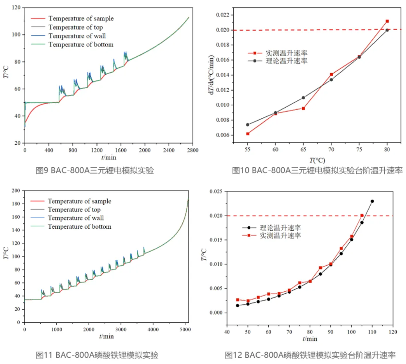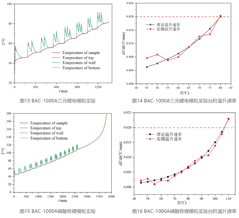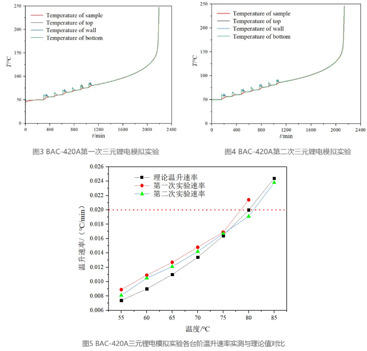 對(duì)于磷酸鐵鋰模擬實(shí)驗(yàn),標(biāo)樣的理論Tonset溫度為106.7℃,兩次實(shí)驗(yàn)的Tonset檢出臺(tái)階均為110℃,符合預(yù)期。上述實(shí)驗(yàn)結(jié)果均滿足一個(gè)臺(tái)階步長(zhǎng)(5℃)的誤差范圍。實(shí)驗(yàn)中各臺(tái)階實(shí)測(cè)溫升速率與理論值偏差均在±0.003℃/min內(nèi)。