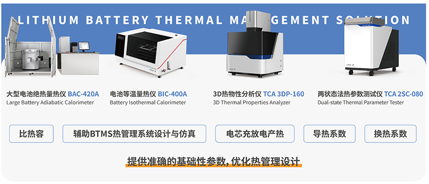 熱管理測試解決方案可對電池包或系統(tǒng)的熱擴散特性進行驗證,獲取電池絕熱溫升、電池導熱系數(shù)等熱管理仿真核心參數(shù),確保電池產(chǎn)品滿足國家安全標準的要求。