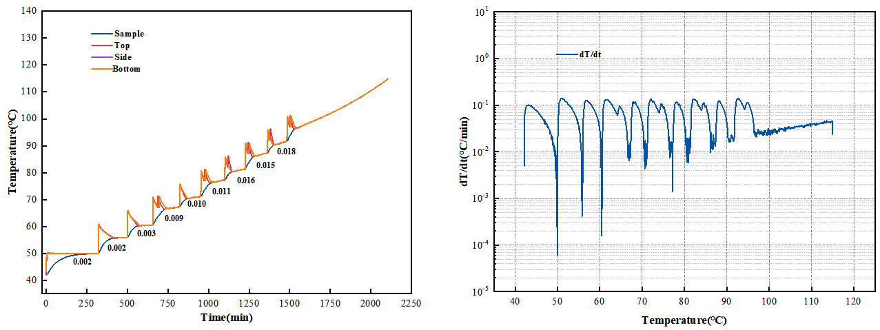 圖5使用金屬板夾具的標(biāo)準(zhǔn)電阻塊HWS溫升(左圖)及溫升速率-溫度(右圖)曲線