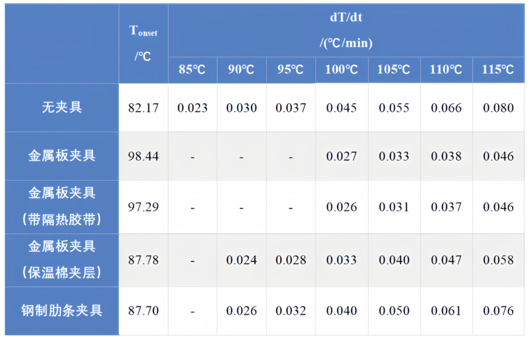 在上述實(shí)驗(yàn)過程中,電池在高溫下內(nèi)部產(chǎn)氣易發(fā)生鼓脹,通常需要使用夾具固定溫度傳感器,防止由于傳感器虛接或脫落導(dǎo)致測(cè)溫異常,確保測(cè)定數(shù)據(jù)的準(zhǔn)確性。然而,夾具存在一定的熱惰性,實(shí)驗(yàn)過程中可能會(huì)吸收電池釋放的部分熱量,導(dǎo)致電池溫升速率的檢測(cè)結(jié)果偏低,自放熱起始溫度Tonset等測(cè)定結(jié)果滯后。