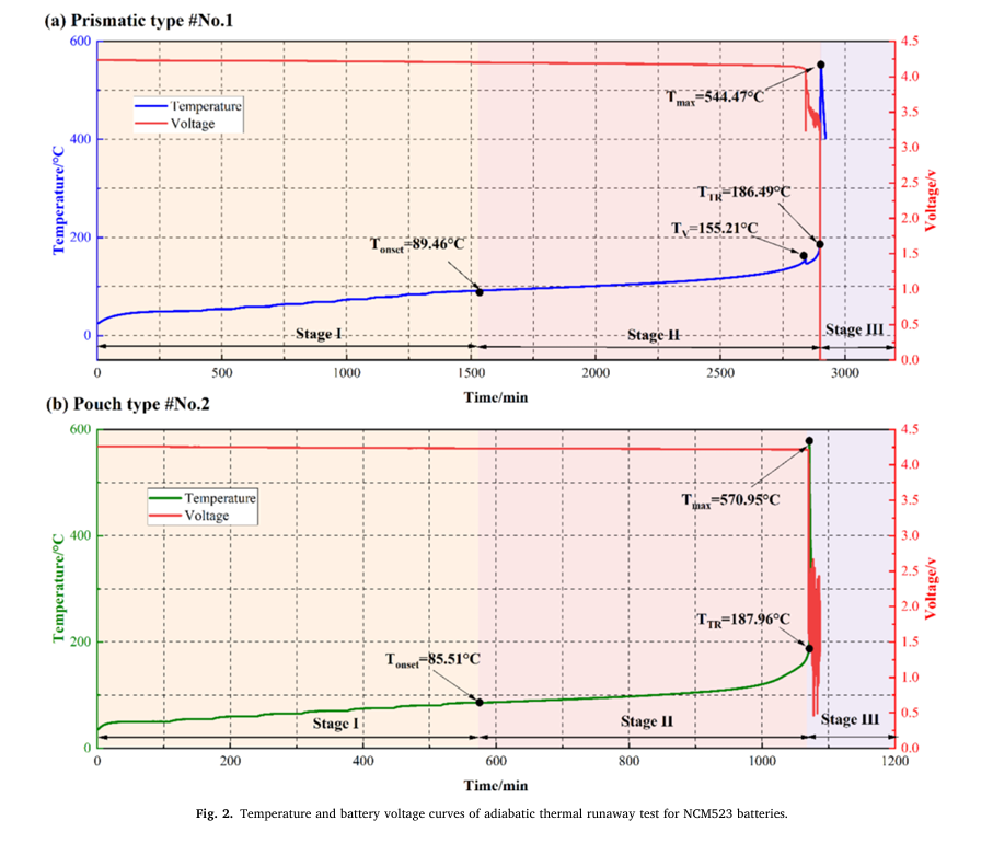 2.同一體系的方形和軟包鋰離子電池的熱失控過(guò)程存在差異。方形電池的TTR隨著鎳含量的增加而降低,從NCM532的186.49°C逐漸降低至NCM90505的156.92°C,而軟包電池的TTR保持在190°C左右。此外,軟包電池在達(dá)到TTR后會(huì)有一個(gè)誘導(dǎo)期才會(huì)快速升溫。