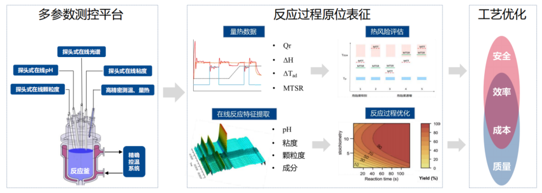 在上文提到的原料藥開發(fā)過程中,如果我們能夠在合成反應(yīng)過程中對反應(yīng)特征參數(shù)進行實時監(jiān)測無疑能夠幫助研究人員更快、更好地進行工藝開發(fā)和優(yōu)化。原位表征和過程分析(ICPA)平臺集成了功能強大的原位、實時測試能力。例如,可以通過在線分子光譜儀實時分析反應(yīng)體系的組分信息及含量變化;可以利用在線粘度計、在線顆粒度、在線PH計等儀器測定體系粘度、顆粒度和PH值等參數(shù)變化;利用反應(yīng)量熱儀測定反應(yīng)放熱速率、絕熱溫升、物料累積等熱安全數(shù)據(jù)。上述測試手段和數(shù)據(jù)將幫助試驗人員進行反應(yīng)過程分析、機理研究和風險評估,并從安全、質(zhì)量、成本等維度快速、高效地進行原料藥合成工藝優(yōu)化。