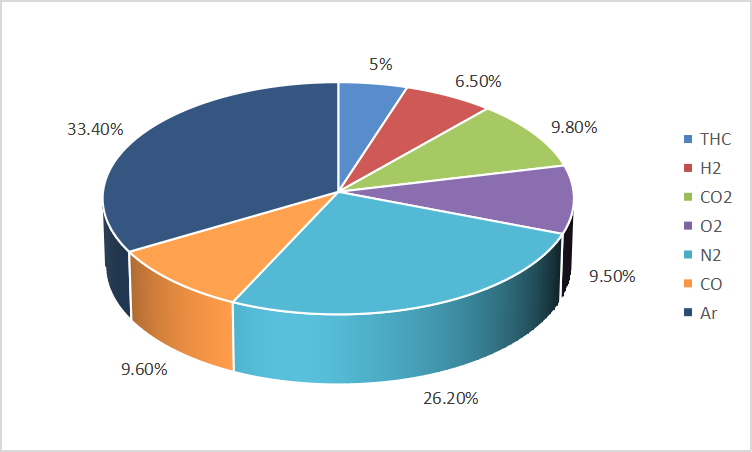 在本案例中,采用國內(nèi)某廠家50A·h、100%SOC的三元鋰電池,使用大型電池絕熱量熱儀(仰儀科技BAC-420A型)在惰性氣體氛圍中完成電池?zé)崾Э貙嶒?。隨后對電池產(chǎn)氣進行收集,并利用氣相色譜對氣體成分進行分析,結(jié)果如下圖所示: