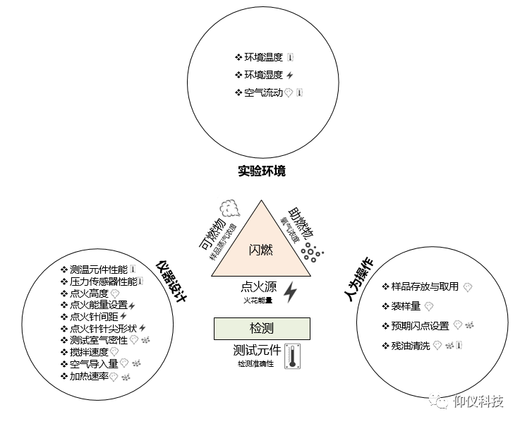 可燃液體處于閃點(diǎn)時,液面附近的蒸氣濃度就是爆炸下限濃度(CLFL)。對于閉口閃點(diǎn)測試,測試過程中樣品蒸氣濃度累積至CLFL是一個復(fù)雜的非線性、多因素耦合的過程,是液體蒸發(fā)、氣體擴(kuò)散、自然對流、強(qiáng)制對流、氣體氧化和燃燒等效應(yīng)持續(xù)或間歇作用累加的結(jié)果。另一方面,閃點(diǎn)測試結(jié)果又取決于蒸氣引燃效果與燃爆增壓檢測能力。以ASTM D6450和ASTM D7094的測試方法為例,圖2總結(jié)了可能影響閃點(diǎn)的各種因素,主要可分為儀器設(shè)計(jì)、實(shí)驗(yàn)環(huán)境和人為操作三方面因素。