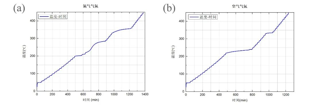 圖1 (a)氮氣和(b)空氣氣氛下樣品溫度隨時間變化曲線