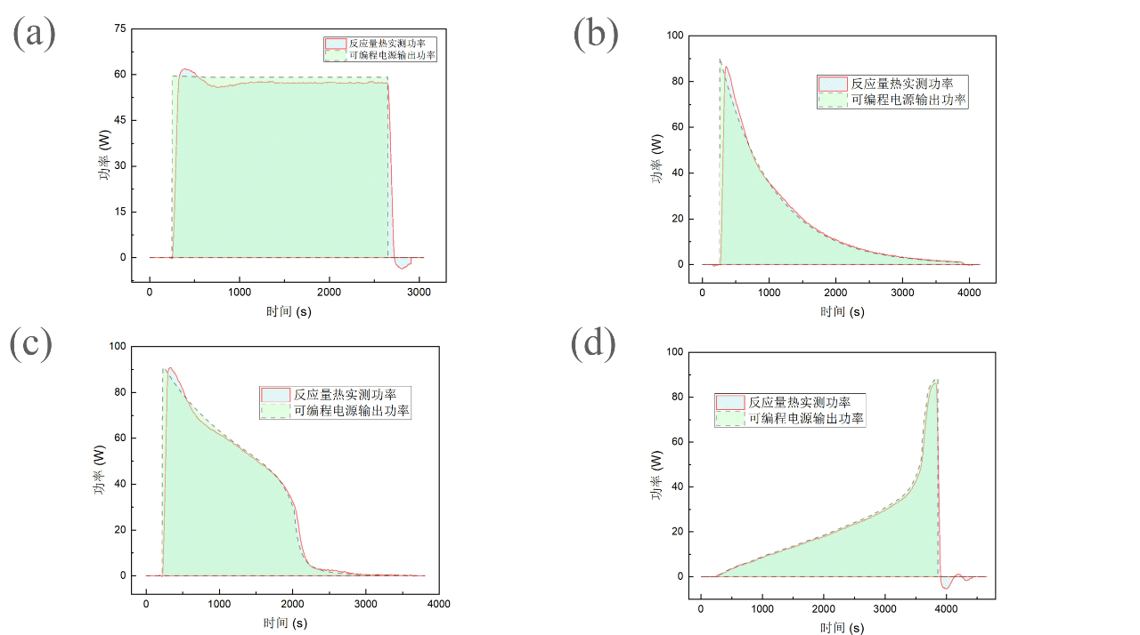 圖3 焦耳熱模擬的(a)間歇零級(jí)反應(yīng)、(b)間歇二級(jí)反應(yīng)、(c)半間歇二級(jí)反應(yīng)和(d)自由基聚合反應(yīng)放熱測(cè)量結(jié)果