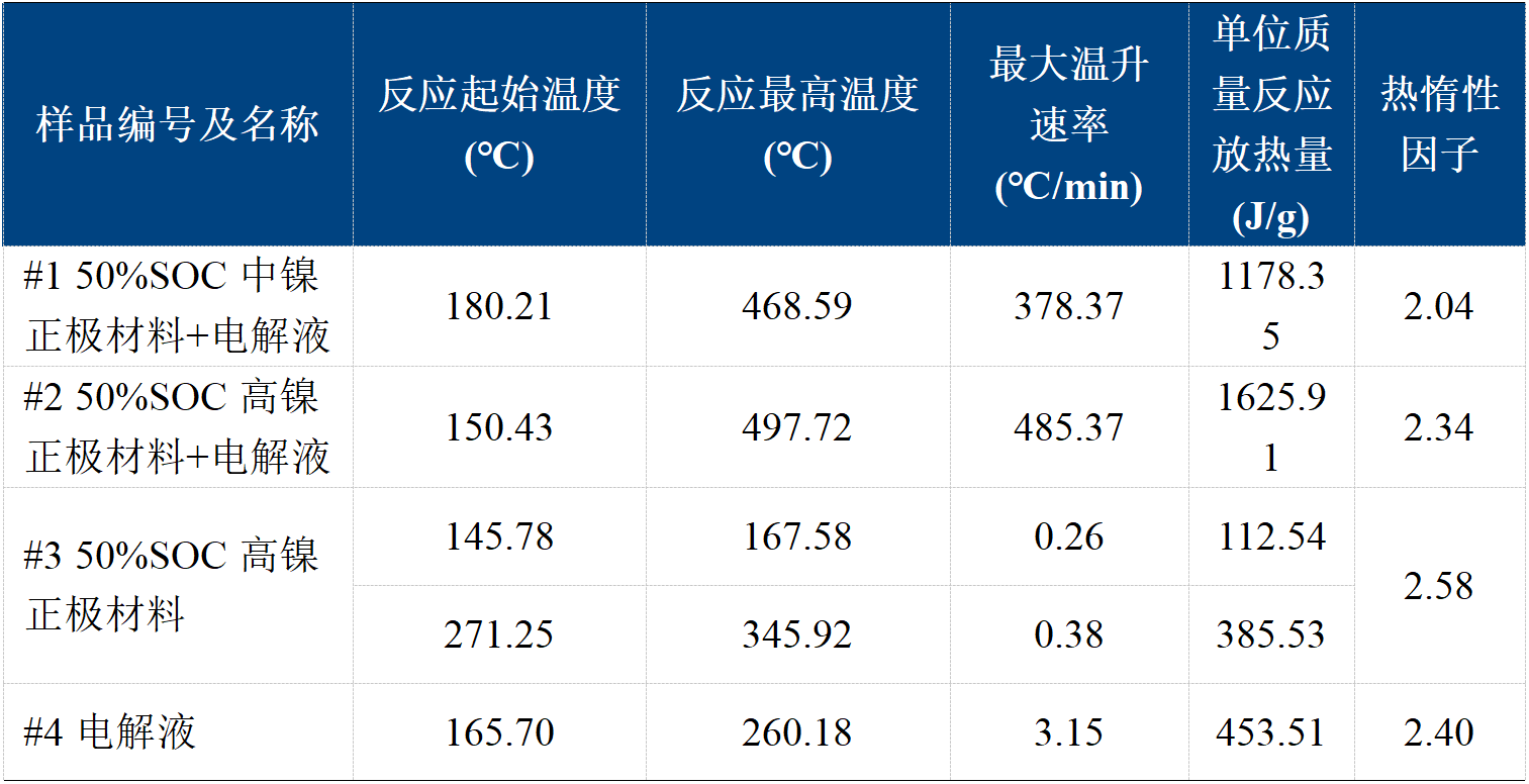 如圖4與表2所示,50%SOC中鎳正極材料&電解液混合物的自放熱起始溫度高于高鎳材料&電解液的數(shù)值,其反應(yīng)最高溫度和最大溫升速率低于高鎳材料&電解液的數(shù)值,證明高鎳正極的熱穩(wěn)定性相對(duì)較低。