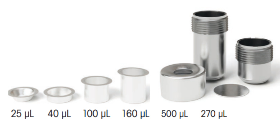 坩堝體積具有15μL~ 900μL的選型范圍,例如15、20、25、30、40、70、100、160、300、600、900uL的規(guī)格。小體積坩堝的信號(hào)時(shí)間常數(shù)小,熱流滯后性低;熱效應(yīng)較弱的樣品可使用大容積坩堝,提高測(cè)試樣品量。