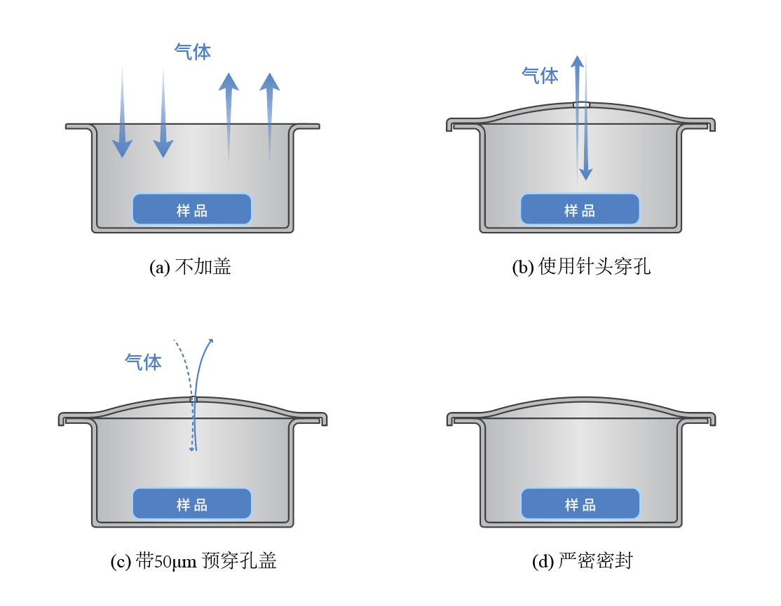 坩堝蓋用于密封坩堝,以抑制溶劑蒸發(fā),或壓實(shí)樣品。根據(jù)不同應(yīng)用場(chǎng)景,坩堝蓋的使用可分為4種情況: