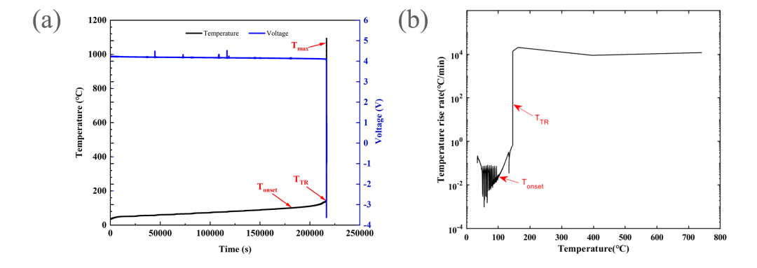 圖2 190Ah電池?zé)崾Э?a)溫升/電壓-時間曲線和(b)溫升速率-溫度曲線