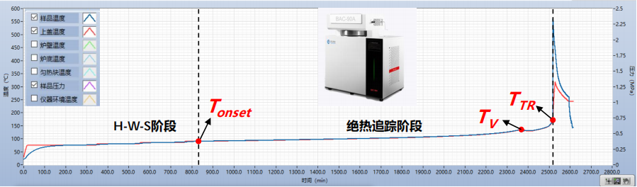 以18650電池為例,可利用小型電池絕熱量熱儀進行測試。利用儀器的H-W-S工作模式進行熱失控實驗,可以得到如圖3所示的電池熱失控溫升曲線。曲線前半部分為“H-W-S” 模式,儀器將通過外部加熱實現(xiàn)電池臺階式升溫,并重復進行加熱-等待-搜尋過程,直至檢測到鋰電池開始自放熱。隨后儀器將自動跳轉(zhuǎn)為“絕熱追蹤”模式,電加熱系統(tǒng)將控制電池周圍的環(huán)境溫度緊跟電池溫度變化,確保電池產(chǎn)熱完全用于升高自身溫度。通過鋰電池熱失控曲線,我們可以對其中一些特殊的溫度點進行測定和分析,評估電池的熱安全性能。例如,Tonset是鋰電池自放熱起始溫度,電池自產(chǎn)熱速率高于0.02 ℃/min,可以認為該溫度下SEI膜開始分解。高于此溫度,電池將出現(xiàn)明顯的自產(chǎn)熱;而TTR是熱失控引發(fā)溫度,一般定義為電池的自產(chǎn)熱速率高于1℃/s 的溫度。在此溫度后,電池將出現(xiàn)劇烈溫升,溫升速率可能高達105 ℃/min,同時一般會伴隨產(chǎn)生大量的光和熱;Tmax是鋰電池熱失控過程能達到的最高溫度。