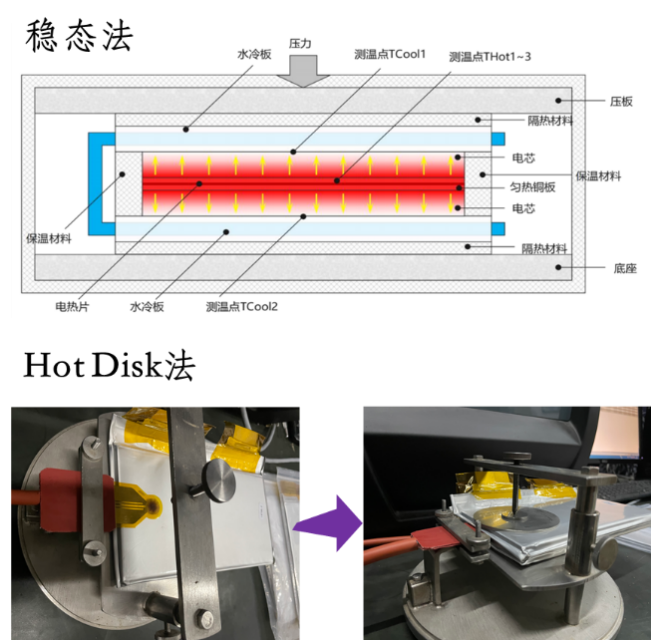 對于硬殼電池的導(dǎo)熱系數(shù),目前業(yè)內(nèi)大多使用經(jīng)驗值或原理模型進行估計。而軟包電池導(dǎo)熱系數(shù)的測試則存在一些可行的方法,可分為穩(wěn)態(tài)法和非穩(wěn)態(tài)法。穩(wěn)態(tài)法作為一種傳統(tǒng)方法,對樣品導(dǎo)熱系數(shù)的測定結(jié)果相對準確。但是該方法對樣品尺寸要求較高、只能得到縱向?qū)嵯禂?shù)且測試時間較長。而非穩(wěn)態(tài)法測試時間短,但是測試準確性不如穩(wěn)態(tài)法。非穩(wěn)態(tài)法主要包括熱線法、閃光法和Hot Disk法,其中熱線法和閃光法不匹配鋰電池測試的應(yīng)用場景,而Hot Disk法則已在行業(yè)內(nèi)被廣泛使用(圖1)。