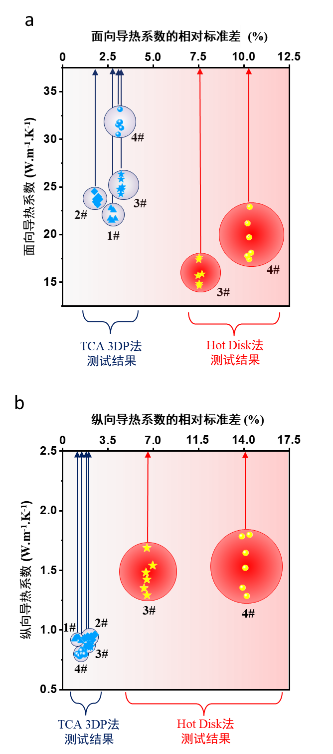 圖3 TCA 3DP方法和Hot Disk方法測得的面向(a)和縱向(b)導(dǎo)熱系數(shù)及其6次重復(fù)實驗結(jié)果的相對標準差