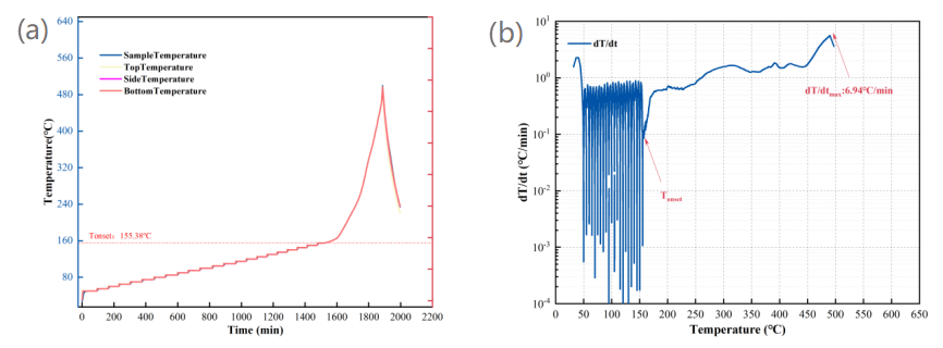 本次實(shí)驗(yàn)采用BAC-90A小型電池絕熱量熱儀的HWS模式測(cè)試?yán)w維鋰電池?zé)崾Э剡^程。該實(shí)驗(yàn)?zāi)J侥軌驕?zhǔn)確測(cè)量得到鋰電池自放熱起始溫度(T1)、熱失控起始溫度(T2)等關(guān)鍵電池?zé)岚踩珔?shù)。